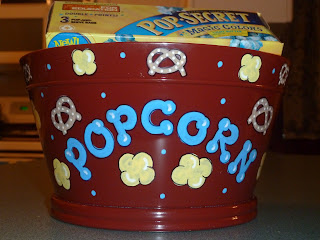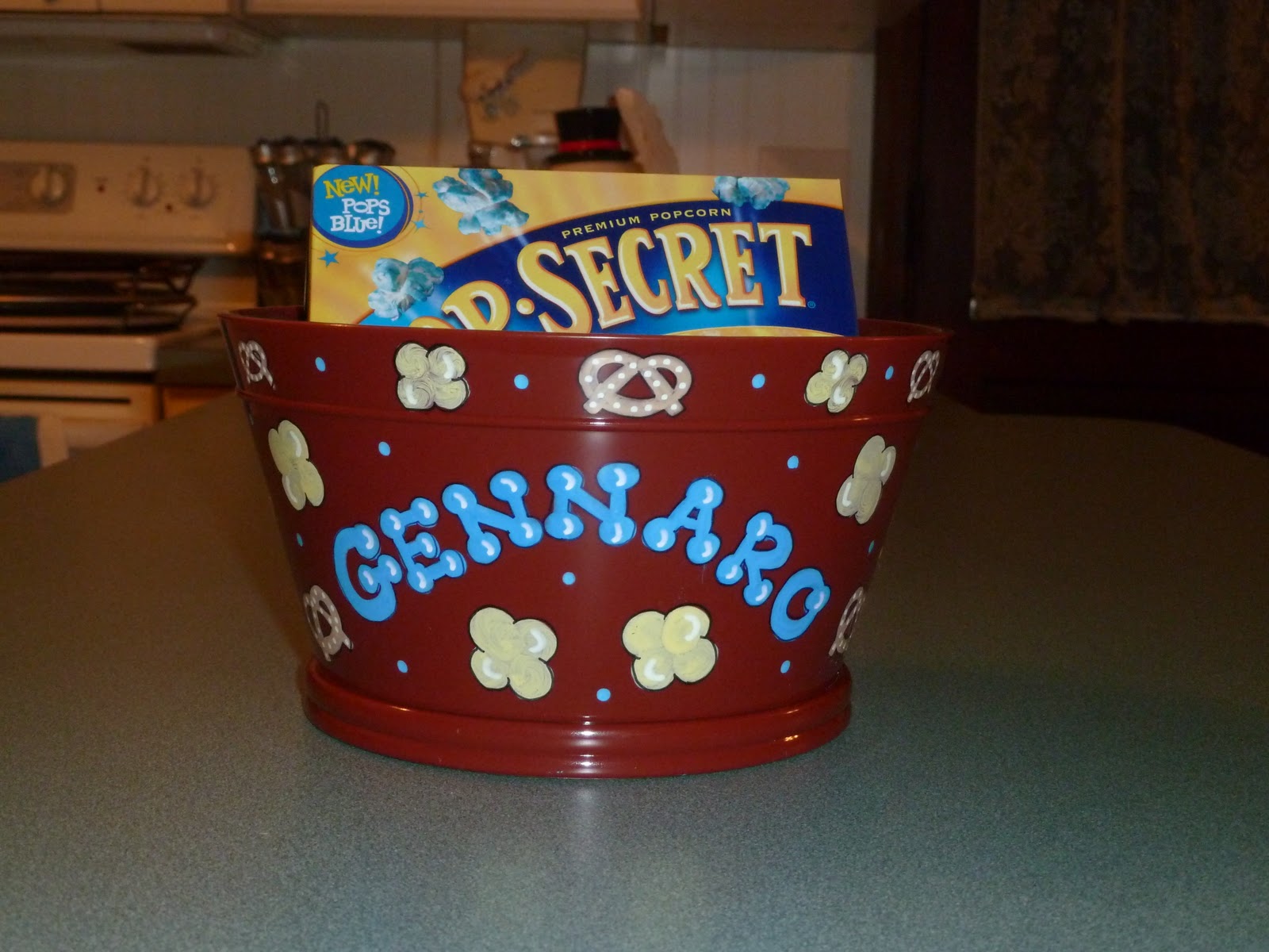 There is one thing, however, I do enjoying doing. Making Christmas gifts! Some of my friends have kids, and this is the best/cheapest way for me to give them something, without feeling guilty about not spending a lot of money! This is a gift I made my little cousin Gennaro. He is 18 months old, and LOVES popcorn! I got this awesome little popcorn bucket at Amazing Savings for .99 cents, personalized it with his name on the front, and the word 'popcorn' on the back with my paint pens, and drew little pieces of popcorn and pretzels all over. And of course I filled it with some weird blue popcorn I found at Target for $2. Not bad!