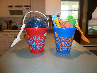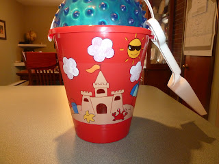 My little cousin, Gennaro, just turned 2 and his birthday party is this weekend. I wanted to make him something that he could actually play with and since I know he goes to the beach a lot, I thought this would be a cute idea! I went to Amazing Savings and got these two sand buckets and filled them with cute little beach toys...a few shovels, some bubbles, a water gun, a beach ball, and some swimming tubes! Then when I got home, I painted the outsides of the buckets with his name on one side, and a beach and water scene on the other using oil paint pens. I really like painting things like this, but I don't get to do it that often, as I only know a handful of kids, and this really isn't an appropriate gift for an adult. When it was all finished I got a little fancy. I wrapped it up in some clear cello wrapping paper, and tied some red ribbon around it. I hope this makes him smile!